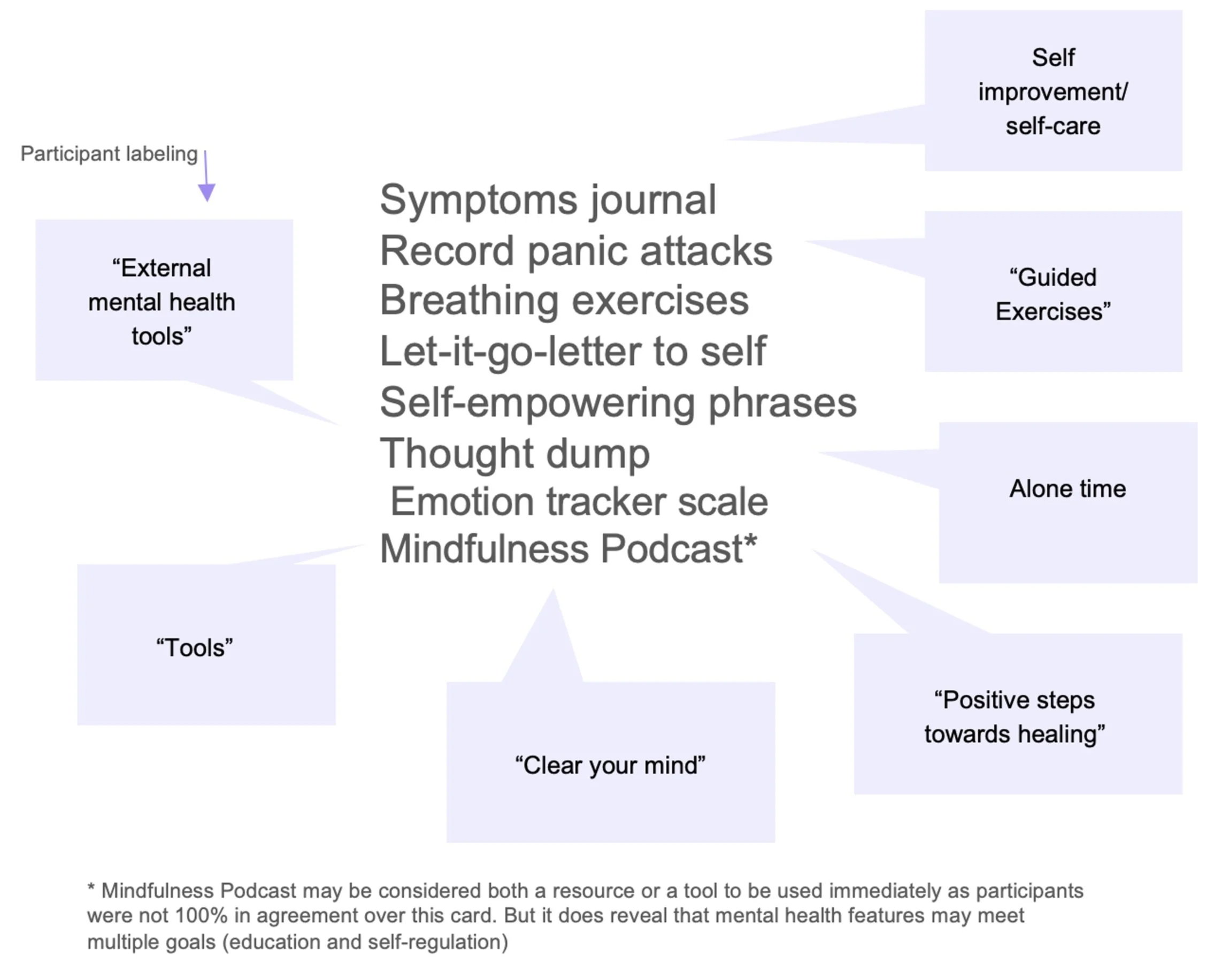 Tools. Certain mental health activities need to be more accessible because it can be done “during alone time” or “to clear one’s mind” or for “self-care”. Participants grouped many of these features together even though they did not hold an overall agreement on a category name.